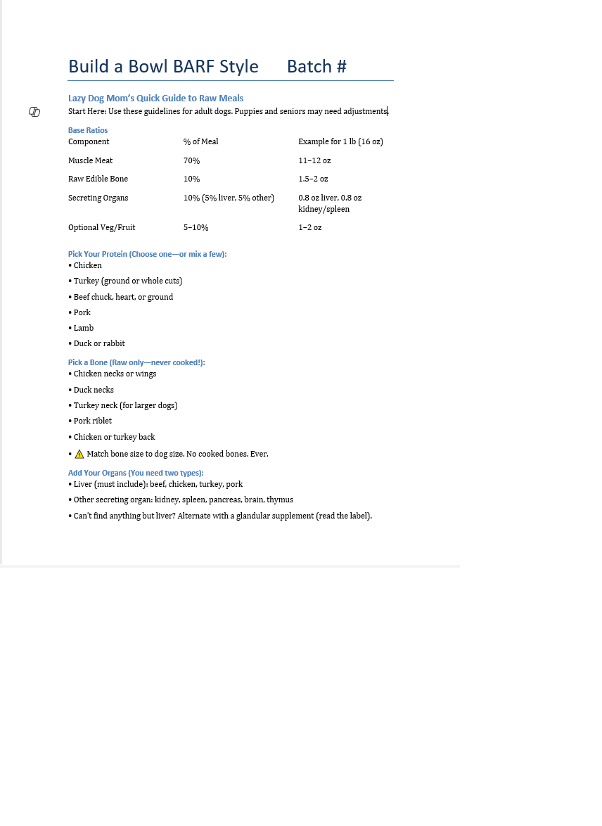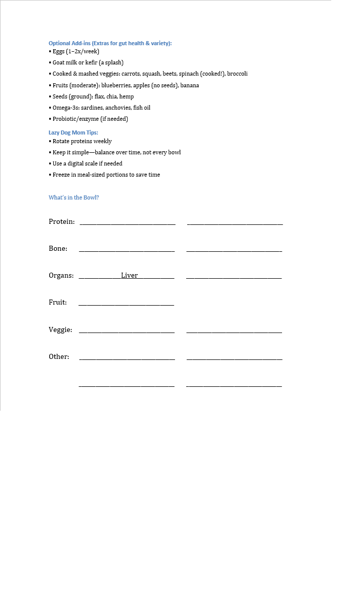 This two-page printable helps you build balanced meals for your dog using simple ratios and real ingredients. Whether you're new to raw or just want a visual guide, this tool keeps it easy, fast, and stress-free.